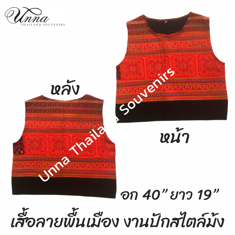 เสื้อพื้นเมือง แขนกุด งานผ้าปักมือสไตล์ม้ง อัดกาวทั้งตัว อก 40“ ยาว 19“